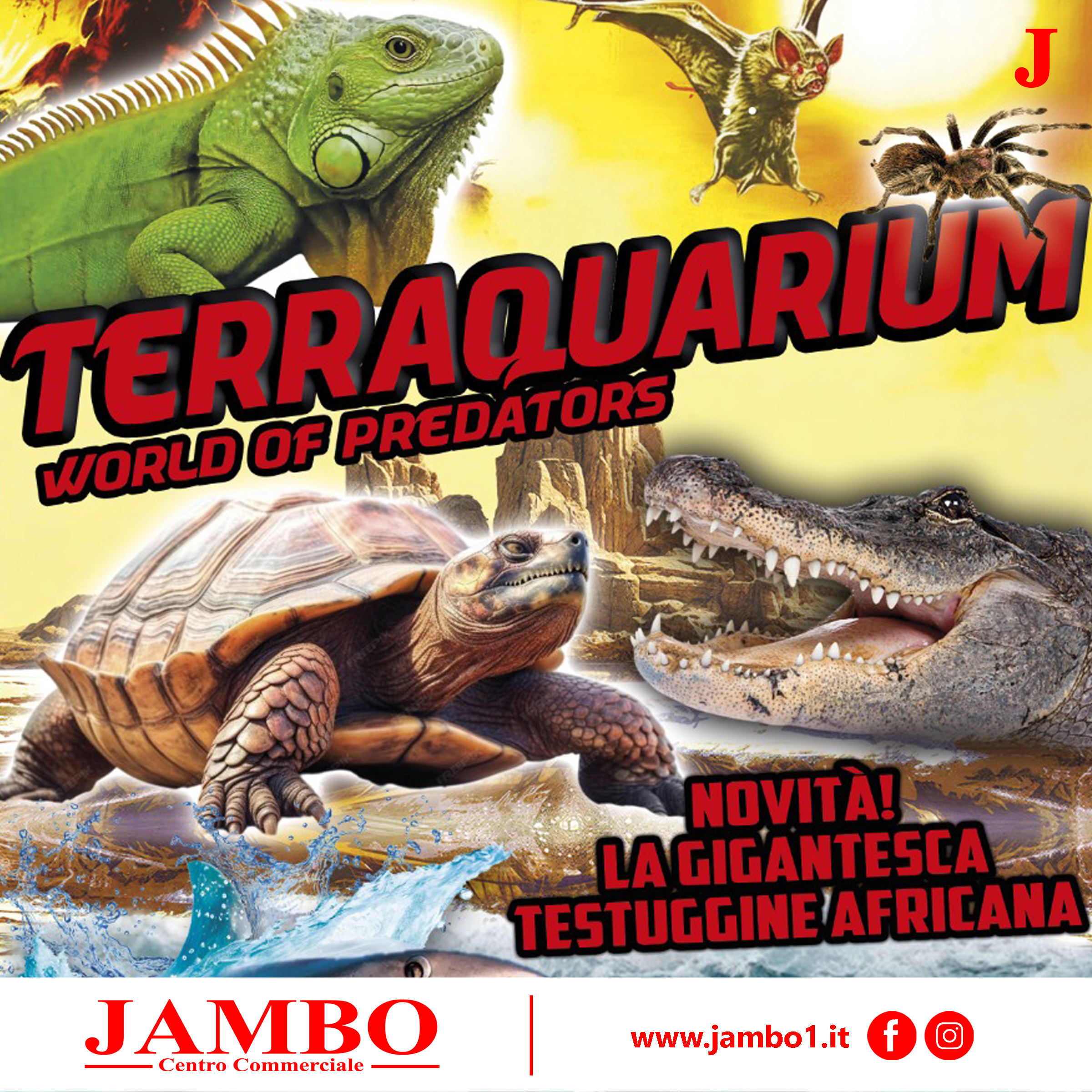 Un’avventura mozzafiato tra enormi vasche e creature straordinarie con la Mostra temporanea Terraquarium - world of predators che fa tappa al Jambo - dal 13 dicembre 2025 al 19 gennaio 2026 - per esplorare affascinanti animali terrestri e acquatici nell’area esterna del Centro.